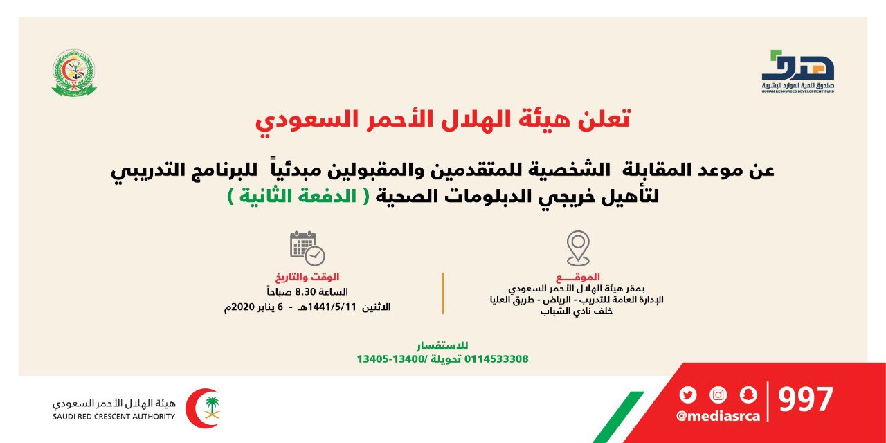 هيئة الهلال الأحمر السعودي يعلن اسماء المقبولين لدخول البرنامج التدريبي لتأهيل خريجي الدبلومات الصحية عاجل الآن